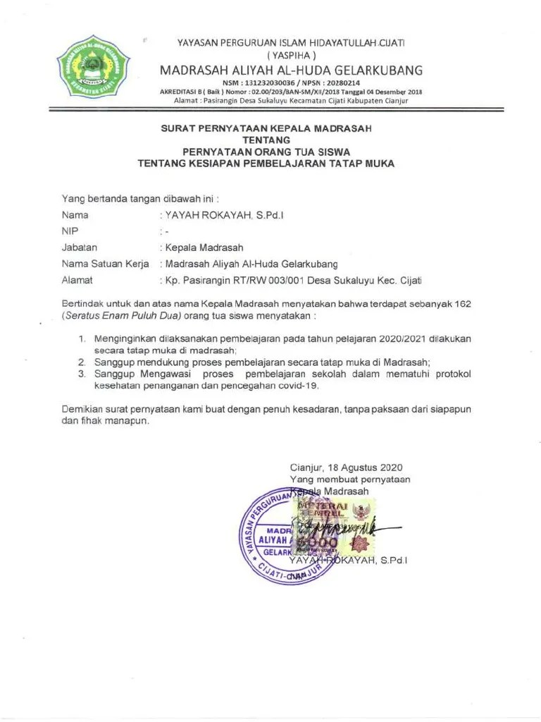 kepala dinas pendidikan dan kebudayaan provinsi jawa tengah memberikan. Sebelum memulai kegiatan tatap muka pada masa new normal sekolah wajib memastikan keadaan lingkungan sekolah bersih dan sehat. Katanya saat ditemui di pendopo rumah dinas wali kota salatiga, rabu (31/3/2021). Ilustrasi seorang murid sedang belajar tatap muka di sekolah. kepala dinas pendidikan (disdik) kota salatiga yuni ambarwati menuturkan, sebanyak 230 sekolahan mendapatkan izin kegiatan pembelajaran tatap muka (ptm) tahap pertama di salatiga. Bagi satuan pendidikan yang sudah memulai pembelajaran tatap muka Kebijakan itu diatur dalam lampiran surat keputusan bersama (skb) menteri pendidikan dan kebudayaan nomor 01/kb/2020, menteri agama nomor 516 tahun 2020, menteri kesehatan nomor hk.03.01/menkes/363/2020, dan. "prinsipnya dari jenjang mana pun kami oke. Kumpulan gambar contoh surat pernyataan kepala sekolah untuk guru yang benar 2019. Kebijakan ini berdasarkan surat keputusan bersama empat menteri tentang. surat pernyataan diri memang ada beragam tetapi biasanya secara umum itu berisi kesanggupan dari pihak pembuatnya. Sementara itu, untuk semua jenjang sekolah luar biasa, harus menerapkan jarak 1,5 meter dan maksimal 5. Menurut dia, surat persetujuan orang tua siswa dinilai penting untuk memulai sekolah tatap muka.